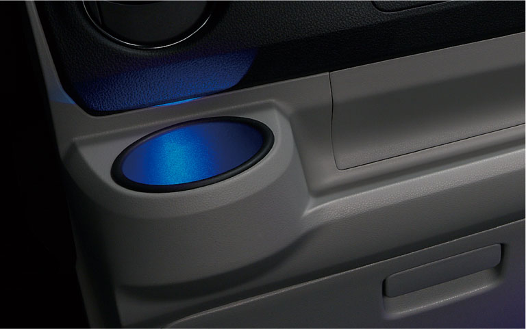 ドリンクホルダー&センターフロアトレイイルミネーション スモールランプと連動して光るイルミネーション。発光色ブルー。 ¥17,688 【消費税抜き¥16,080(本体価格¥7,500+標準取付費¥8,580)】 【適用】全車 ※写真の色、照度は実際と異なる場合があります。