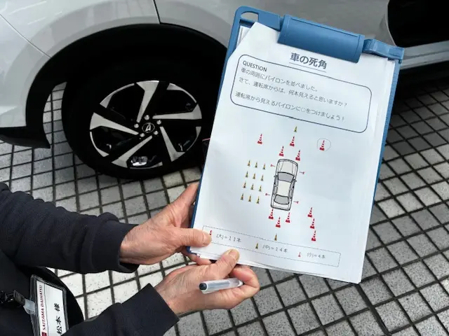 コーンを用いた死角確認では、多くのコーンが配置されているにもかかわらず、実際に運転席に座るとほとんどが見えないことに驚きの声が上がりました。