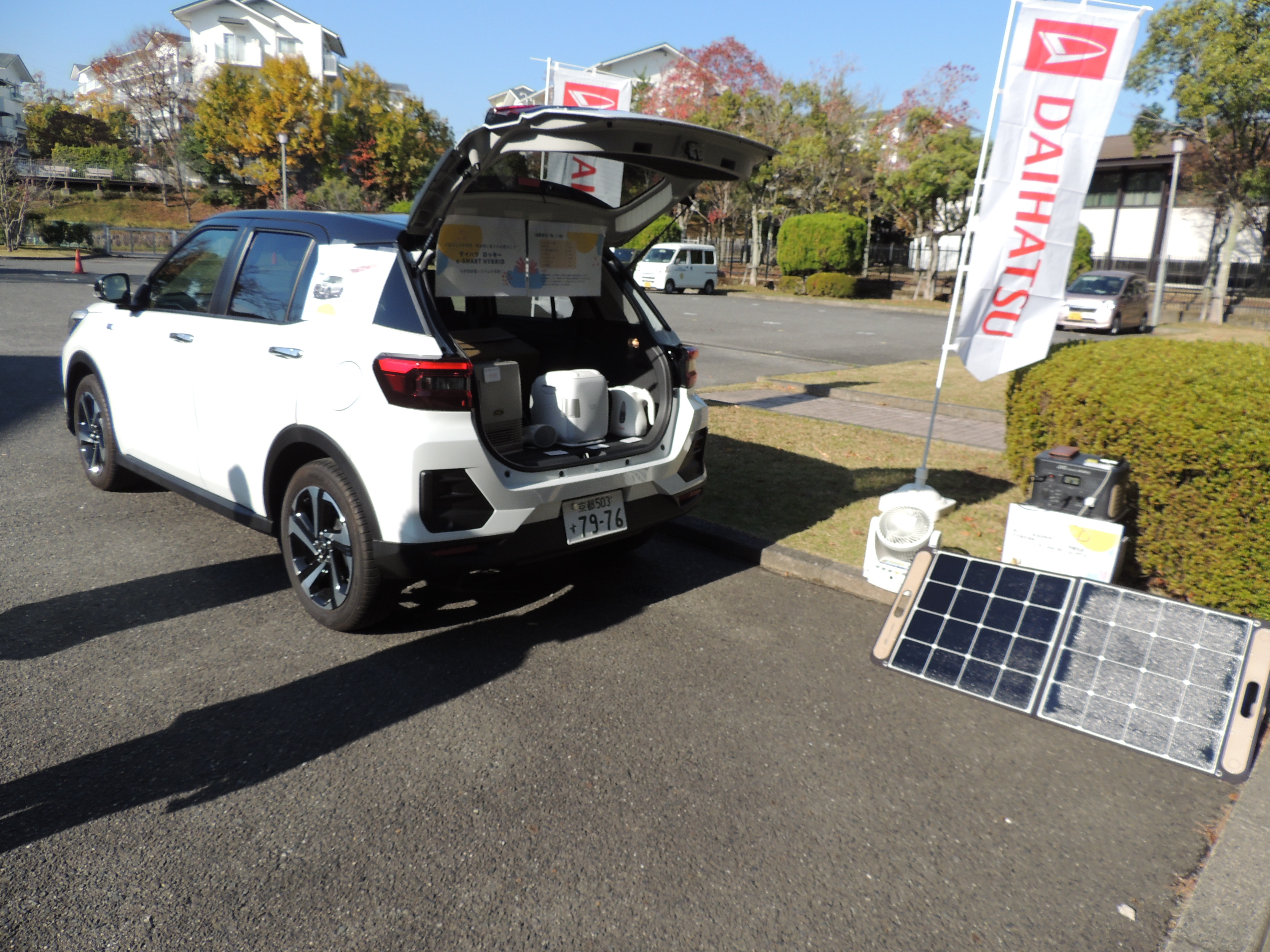 木津川店に配備のロッキーハイブリッド、蓄電用携帯バッテリー、ソーラー発電パネルを展示