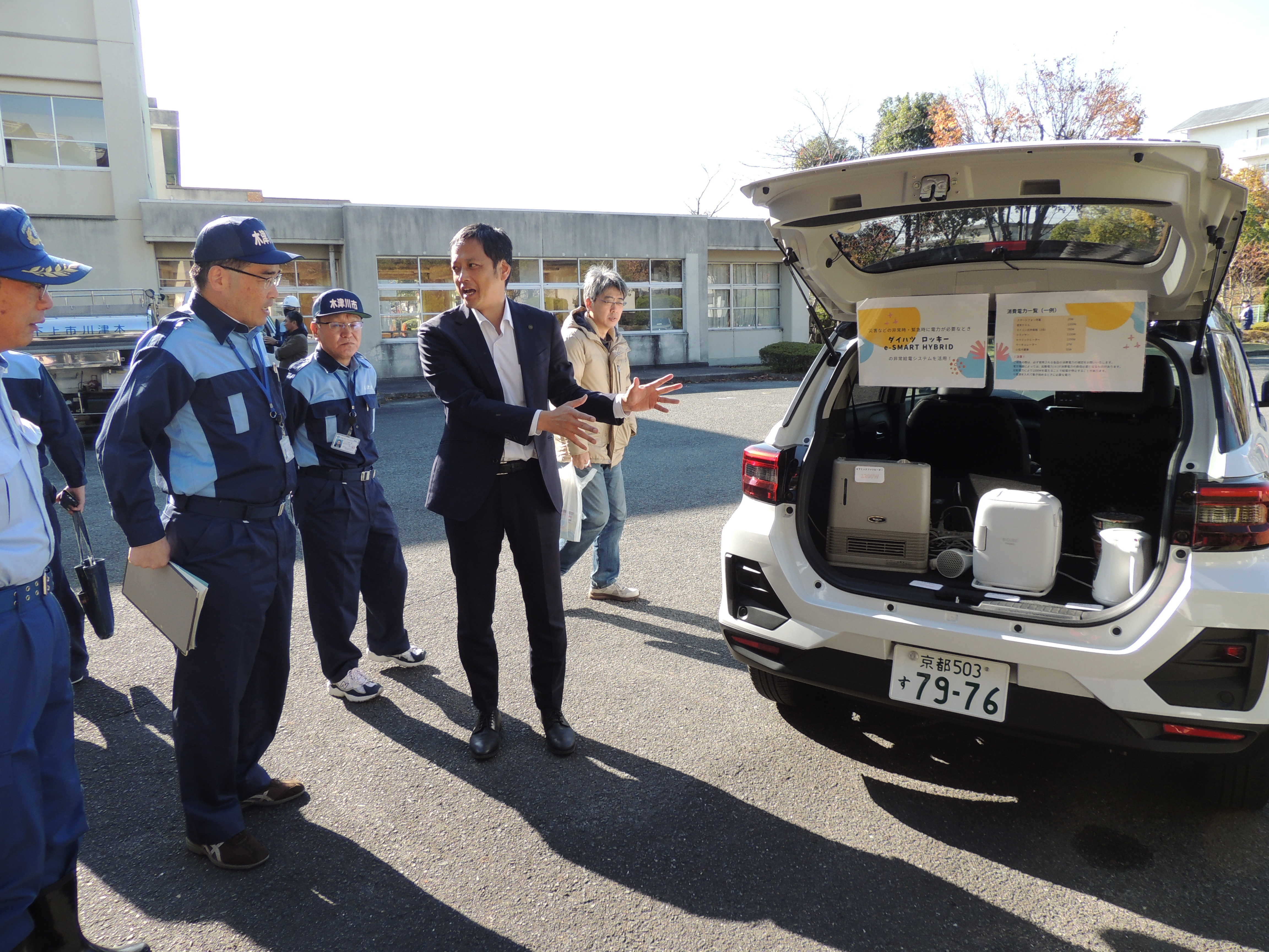 市民のみなさまへは、地域一帯が災害の為に停電になったことをイメージしていただき、避難所で過ごすとなった場合、災害初動のスマートフォン等での安否確認の連絡や実際に電気ケトルなどの機器の使用を行って、給電装置を備える車の実用性を知っていただきました。