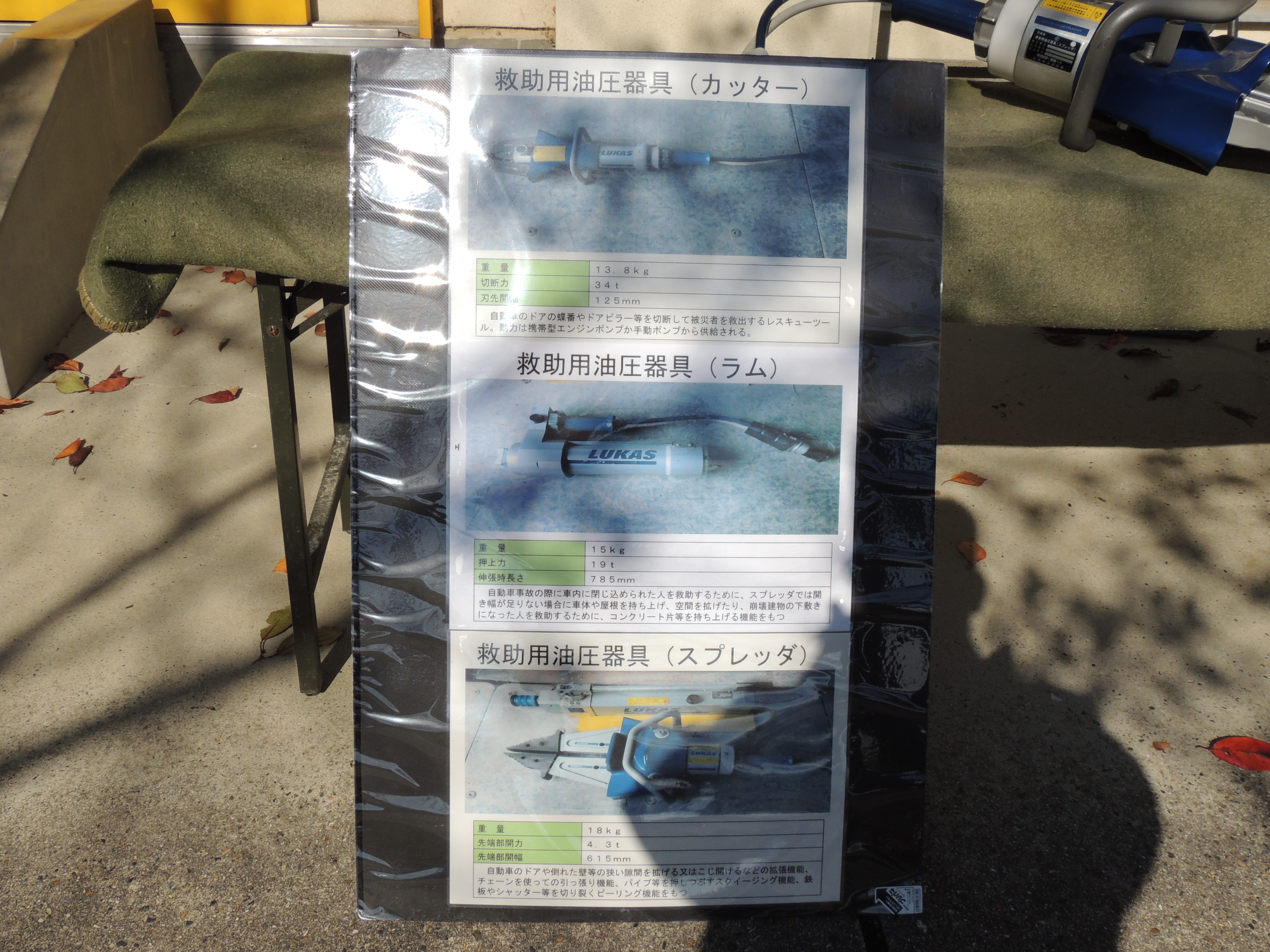 ドアカッターなど救出に使用する機材の展示(実物もありました)