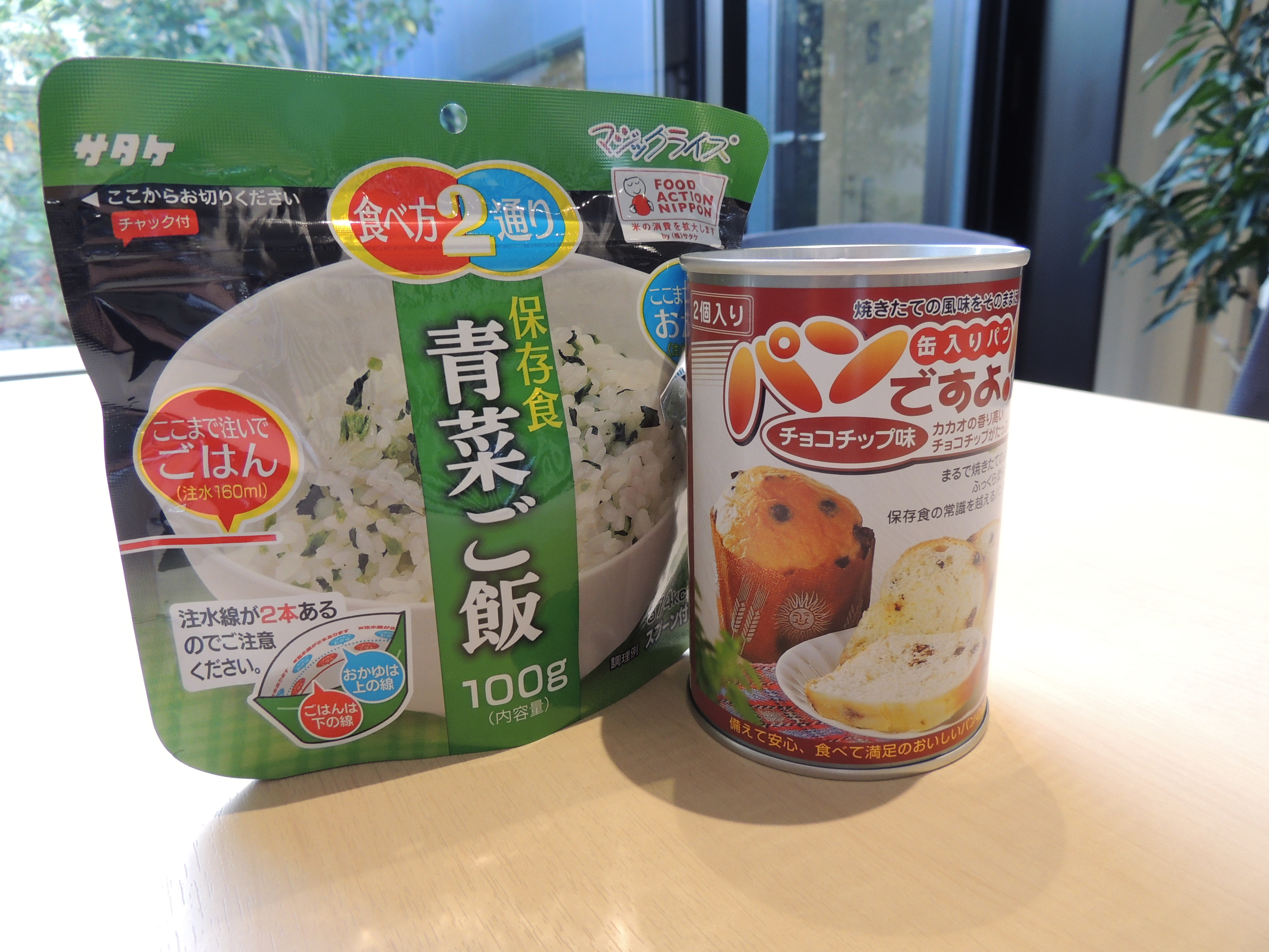 配布頂いた非常食 お湯を注いで10分で出来るご飯と缶入りのマフィンのようなパン(2個)