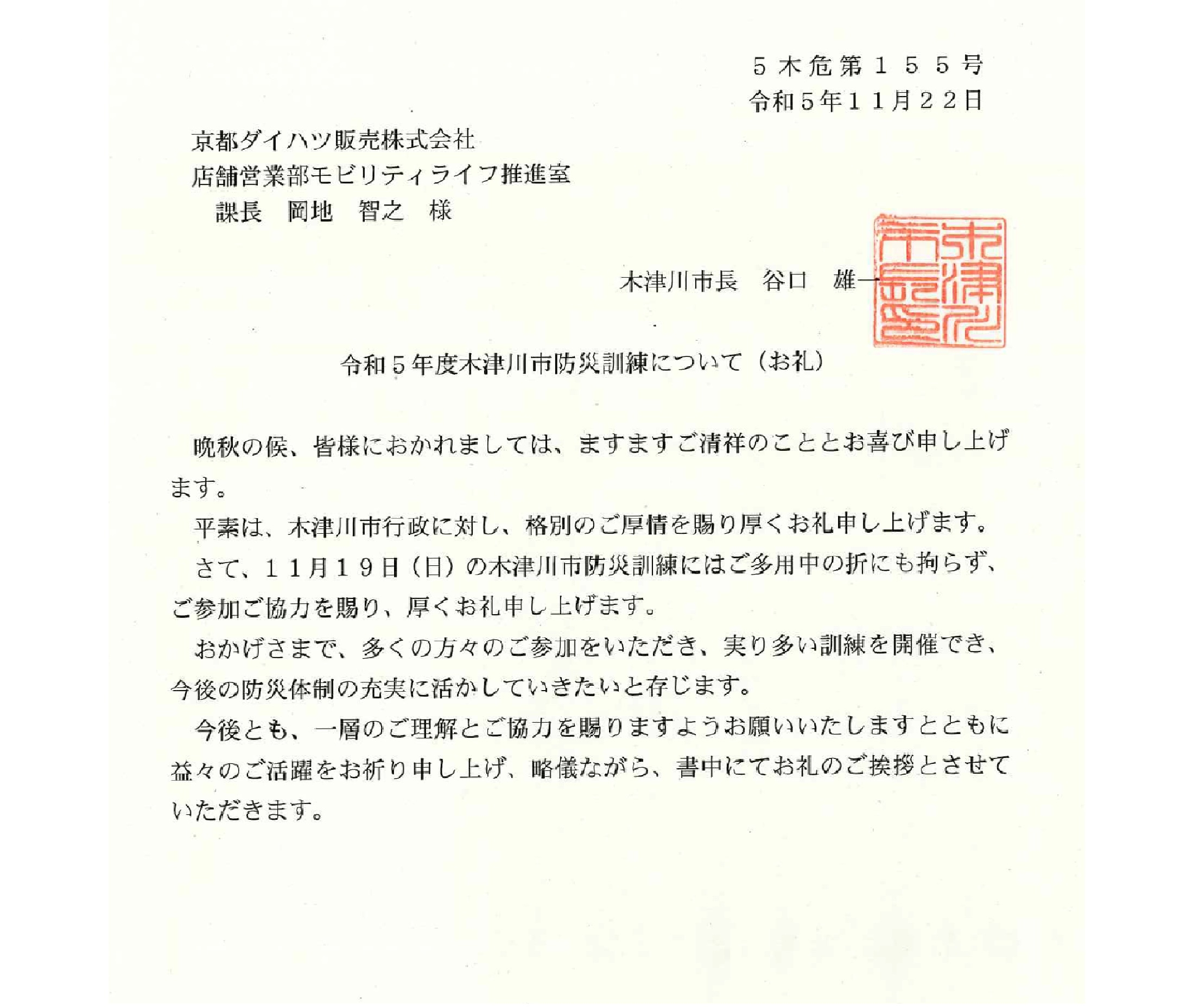 木津川市 谷口市長からのお礼状