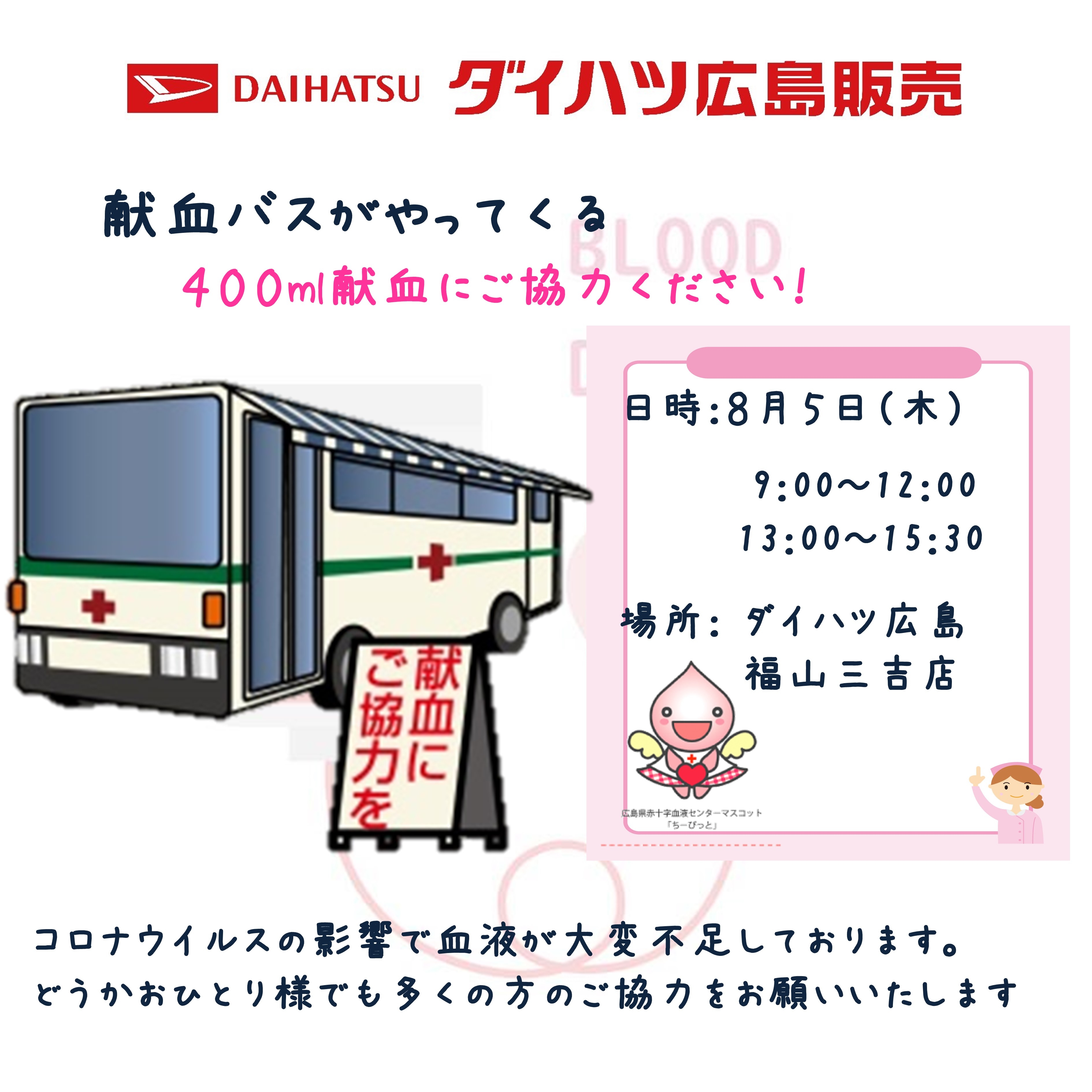 現在、コロナウイルスの影響で血液が大変不足しています。