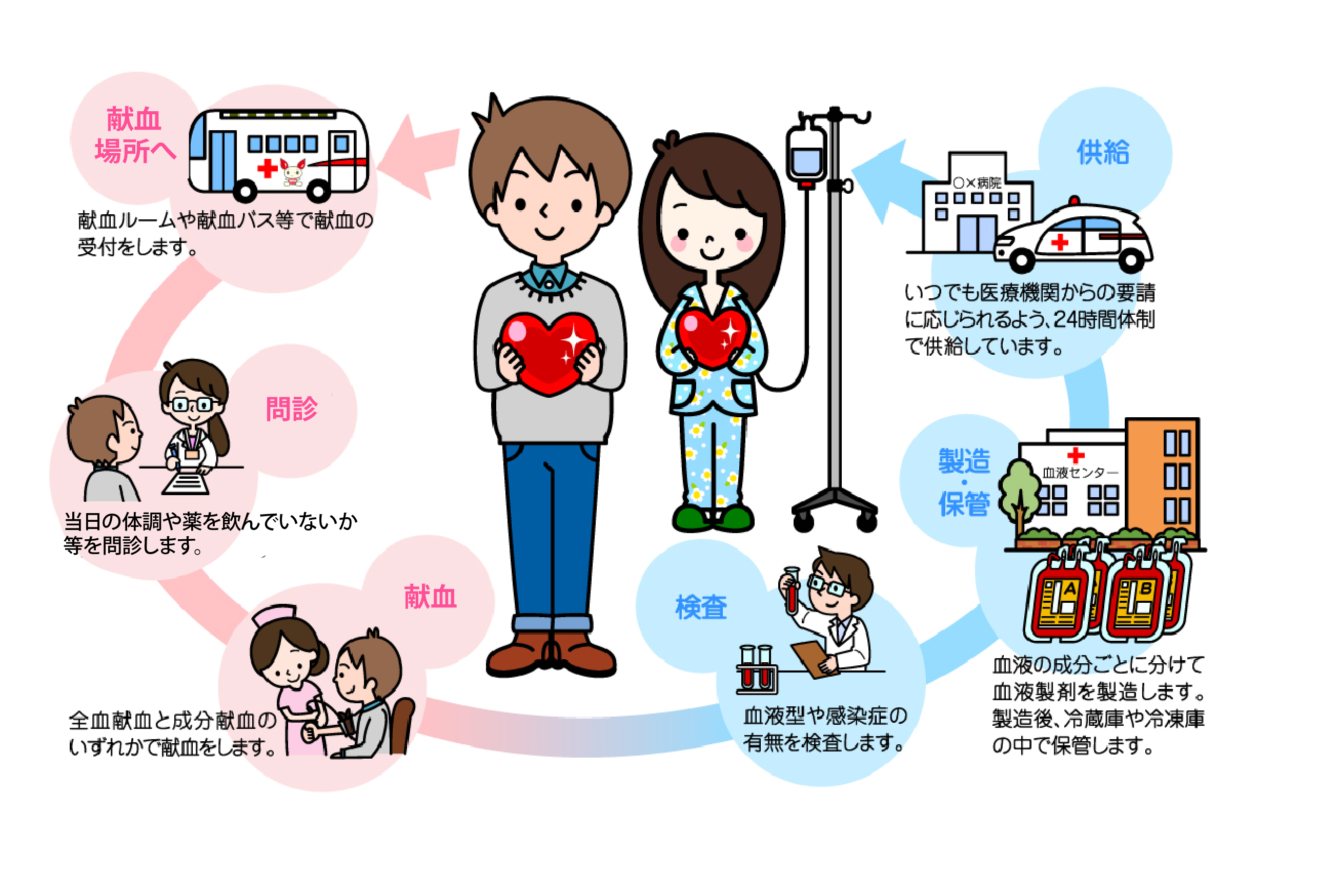 献血は、輸血を必要としている患者さんに、無償で血液を提供するボランティアとなります。