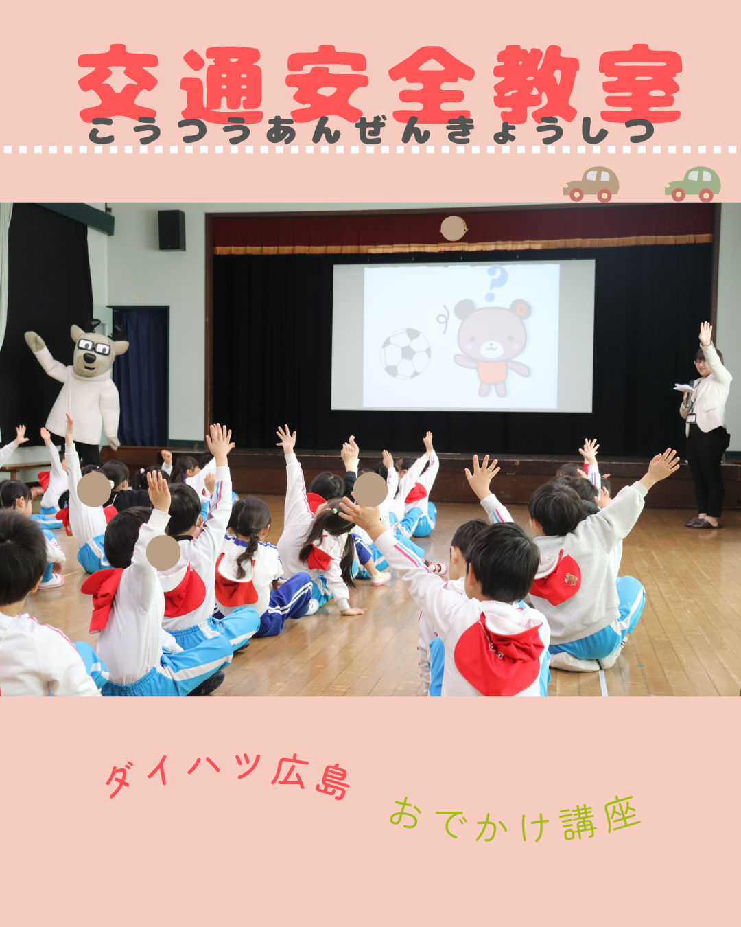 弊社では、『交通安全イベントを通して、小さな命を交通事故から守り、地域の皆様の安心・安全のお手伝いをする』ことを目的として、弊社では秋から春頃にかけて、毎年保育園で子供向けの交通安全教室を開催しております。