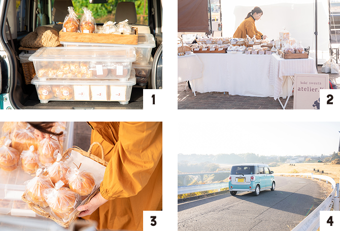 三重県鈴鹿市の「鈴鹿サーキット」から車で20分くらいの住宅街で、「atelier.K bakeshop」をはじめて丸7年。もともと実家の農具小屋だった建物を改装して、パンや焼き菓子などを販売しています。配達やイベント出店などもあり、そのときに活躍するのがムーヴ キャンバス ストライプス。ミントのようなブルーとホワイトのツートンカラーになっていて、フロントのエンブレムやフォグランプもオプションで変更した、こだわりの一台です。地域のマルシェへ出店したときには、バックドアを開けてパンを並べて販売したのですが、かわいくて目立つので重宝しました。でも、うちの子は、ただ見た目がいいだけでなく、機能面もしっかり。サイドドアはスライドなので荷物の出し入れがしやすく、後ろのシートを倒してフラットにすると、荷物がたくさん乗るんです。走りのパワーも問題なく、軽自動車ながら、普通車と遜色ありません。