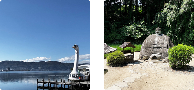 お店を出て諏訪湖沿いに下諏訪を目指すドライブコース。何かを始めるときってアルバムの1曲目がハマるので、➊でスタート。次の曲は、別アルバムの2曲目の➋が自然と思い浮かびました。諏訪湖沿いを走っている頃合いに聴きたいのが➌と➍。そのあと万治の石仏に会うので、➎スピリチュアル・アンビエントの大名作から1曲を。次は万治の石仏を目の前に緊張したと思うので、肩の力が抜けるリラクシンな❻を。それから岡谷市に戻りますが、道中で〈富士アイス〉の「じまんやき」を買い食いして、峠を少し登った鳥居平やまびこ公園へ。道中ではブチアゲU Sヒット・チューン『Hey Ya!』が収録されたアルバムで一層メロウな楽曲➐を。➑は程よくメロウ、程よく清涼感のある名曲。運転しているときだいたい聴く❾も外せません。公園では僕が大好きなレコード屋さんの店主が岡谷の山々を見て発した「岡谷は日本のミナスですね」という一言が嬉しくて、ブラジル・ミナスを代表するミュージシャンの名曲➓を。岡谷の街と諏訪湖、八ヶ岳連峰を望みながら聴いたら格別です。
