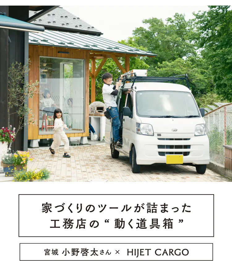 宮城県仙台市で、建築やリフォームを手がける工務店「仙臺屋(せんだいや)」をはじめて7年。我が社の5台目の相棒は、マニュアル車の白いハイゼット カーゴです。思い返せば、独立して最初に買ったのもダイハツの軽トラですし、ミラやオートマ車のハイゼット カーゴなど、いつのまにかダイハツの車ばかり集まっています(笑)。ダイハツの商用車はそれぞれの機能がわかりやすく、かゆいところに手が届く感じ。例えば軽トラの荷台につける幌(シート)のフックの位置が絶妙なところとか。このハイゼット カーゴは乗用車と比べて維持費が抑えられるうえ、軽自動車なのに大容量。しかも4WD※なので馬力があり、雪道はもちろん、坂道やぬかるんだ現場でも大活躍します。マニュアル車なので運転者の操作でパワーを細かくコントロールできるのがお気に入り。帰ってくるとき、ギアチェンジに伴う特徴的なエンジン音は家の中からでも聞こえるそうで、子どもたちが窓から顔を出してくれることもあります。