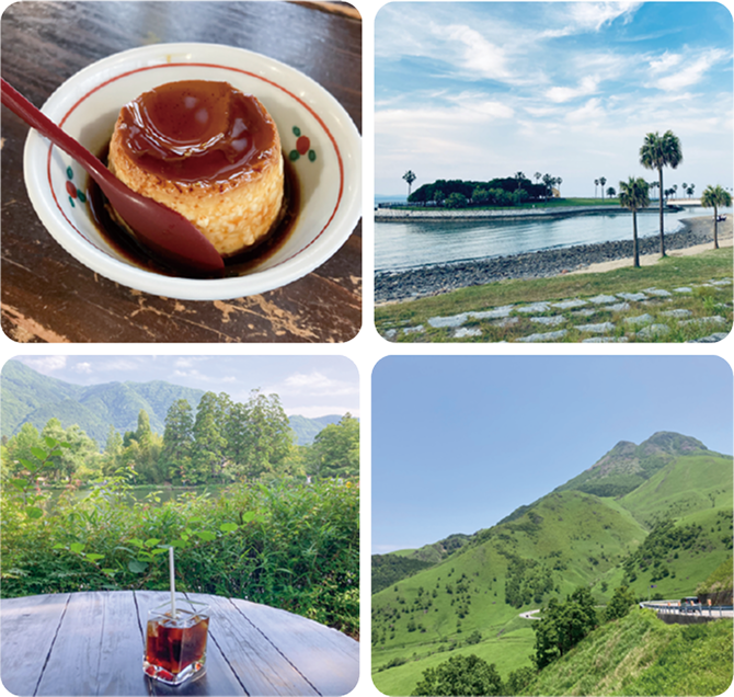 右上:別府湾に面した田ノ浦ビーチ。公園内には人口島が。左上:自然の噴気で蒸す「地獄蒸しプリン」。右下:約50㎞のドライブルート、やまなみハイウェイ。左下:湯布院・金鱗湖のほとりにある「CAFE LA RUCHE」。