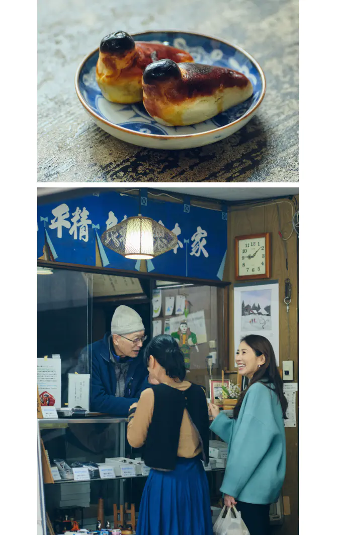 (上)「鳥ぱん」は約130年にわたって販売されている諏訪の銘菓。諏訪湖に舞い降りる鳥たちの姿から着想を得た。(下)「せっかく来てくれたから、一羽もっていきな!」と、鳥ぱんをおすそ分けしてくれる店主の河西さん。