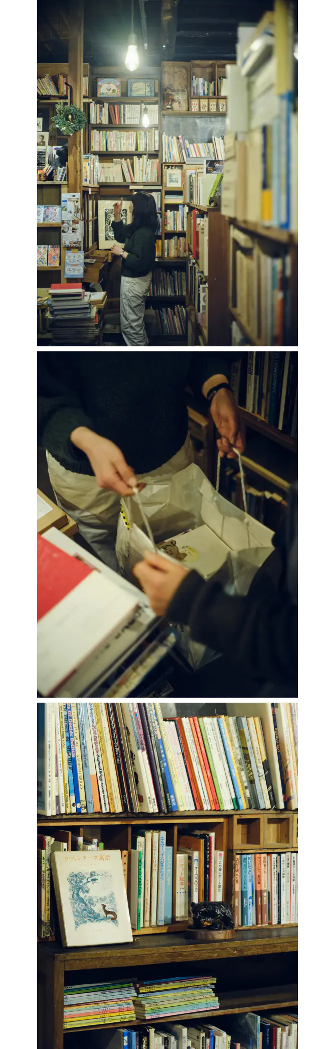 (上)言事堂では展覧会や朗読会、読書会などのイベントが不定期で開催されている。 (中)古書は買い付けに出ることもあれば、地元の人がふらりと持ち込み、その場で買い取ることもある。(下)所狭しと本が並ぶ店内は、思いがけない一冊に出会える宝島のような空間。