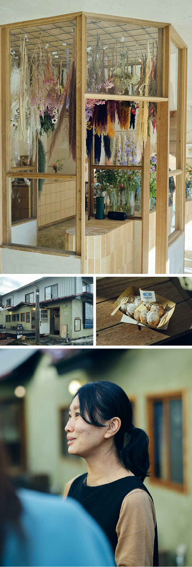 (上)生花店「olde.」の静謐な空間もリビセンの手によるもの。(中左)リビセン主催の複合施設「ポータリー」にはヴィーガンフード店や麻婆豆腐店など個性的なテナントが集う。(中右)「Hoppe」が提供するオランダのお菓子・ポッフェルチェス。