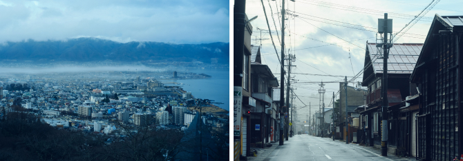 (左)諏訪の町を見晴らすことができる立石公園。ここからの景色は映画『君の名は。』のモデルにもなっており、多くの観光客が訪れる。(右)上諏訪の街にある魅力的な店の多くは、リビセンから徒歩5分程度で巡ることができる。