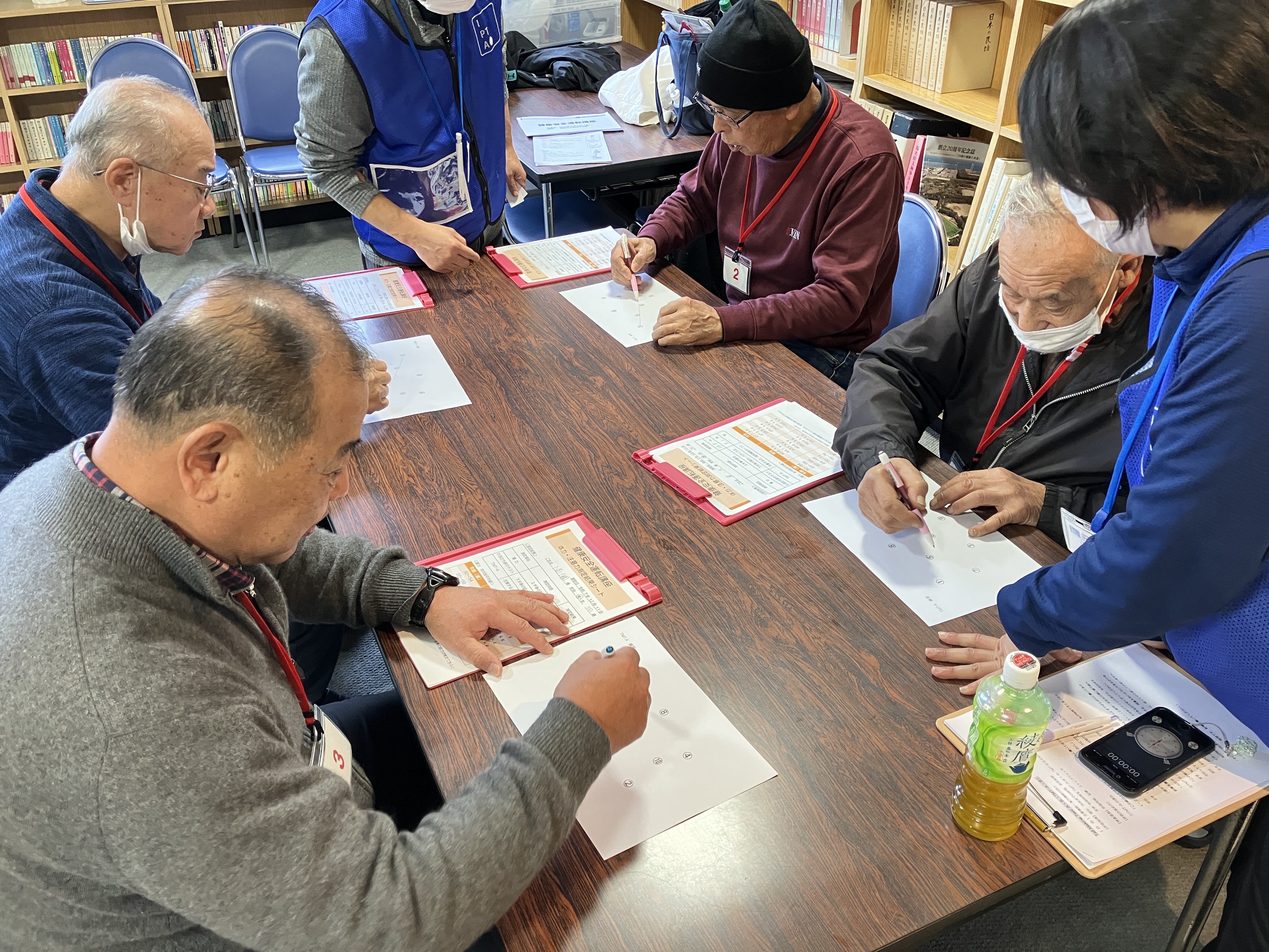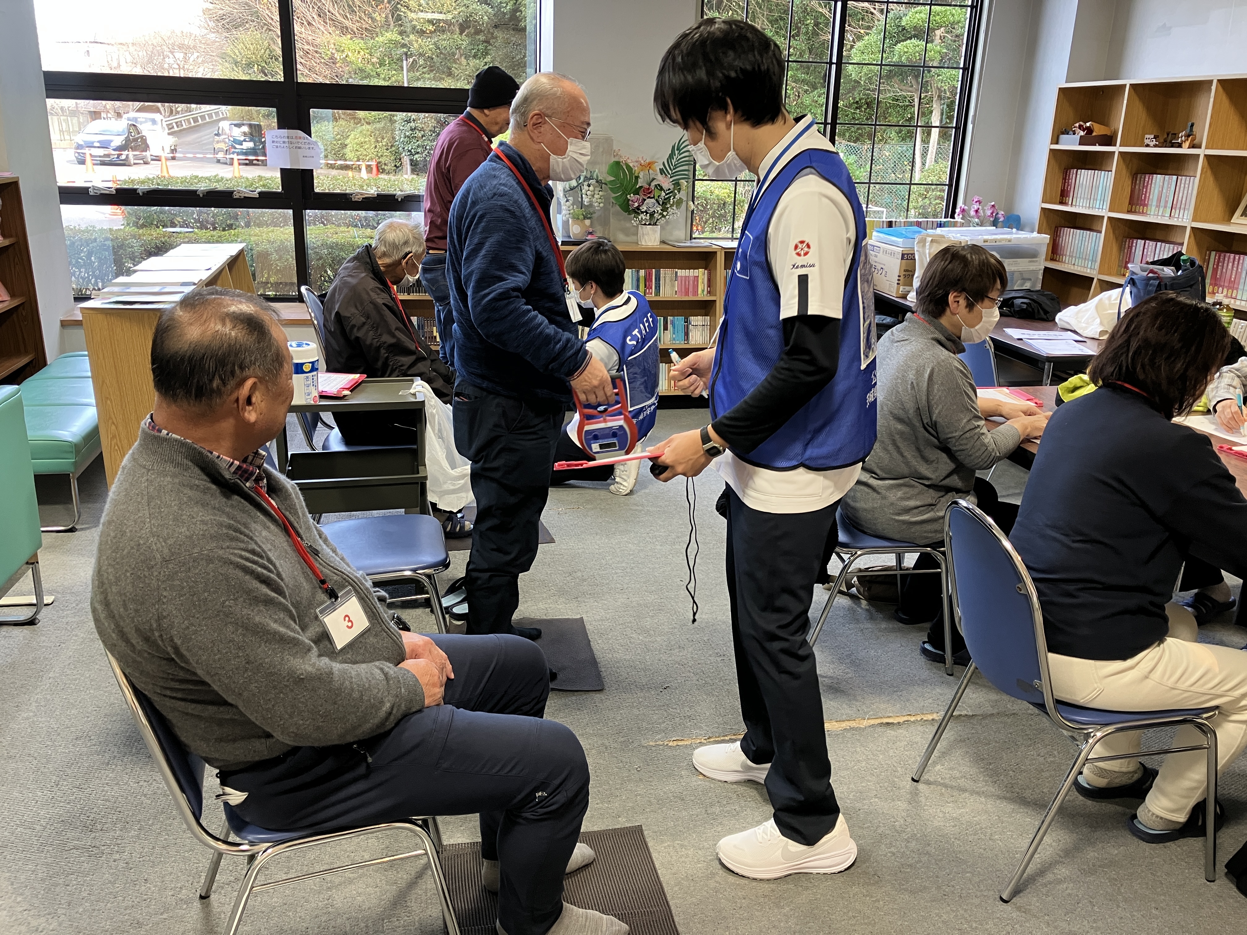 こちらは、握力測定・立ち座りテスト・注意力テストの様子。