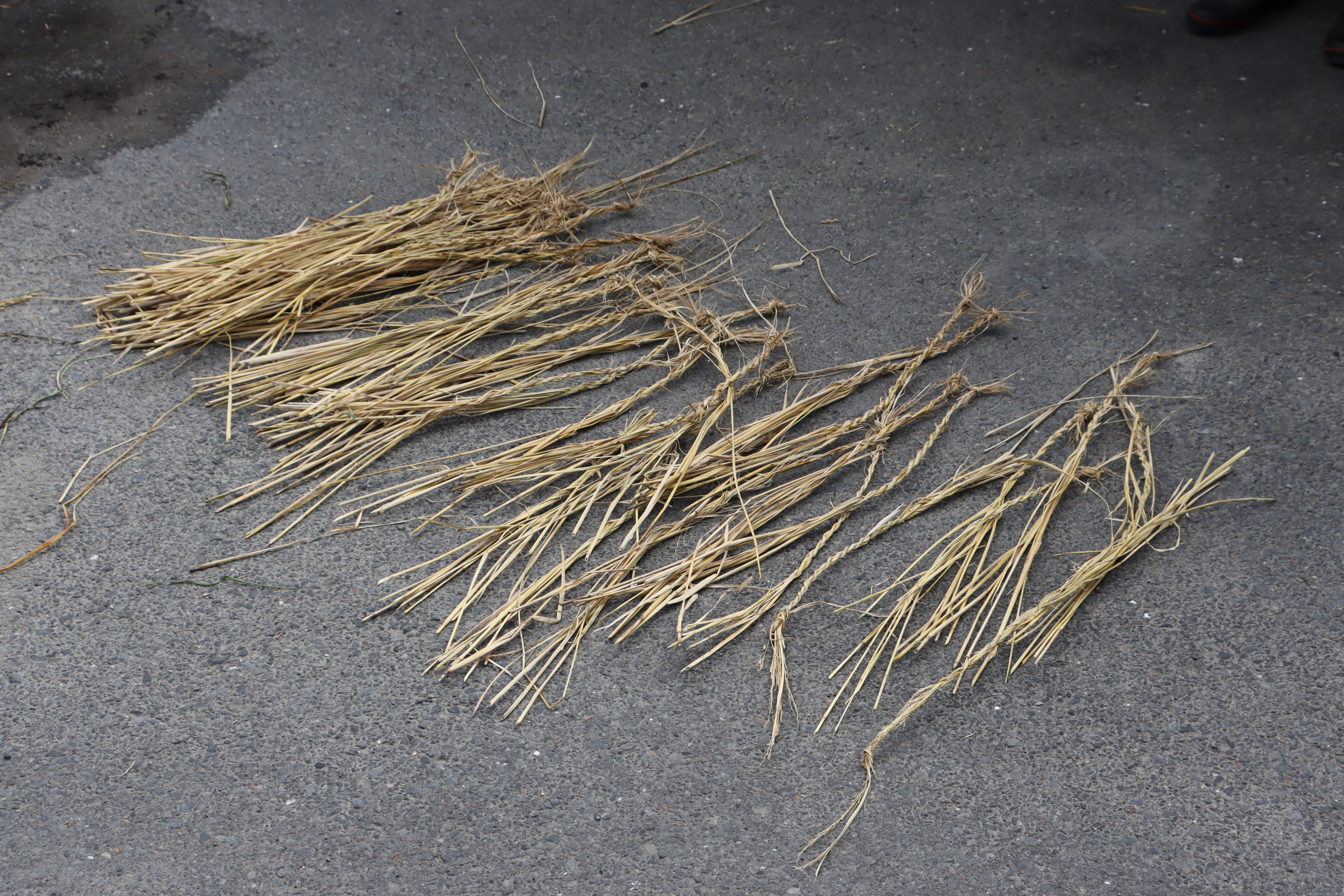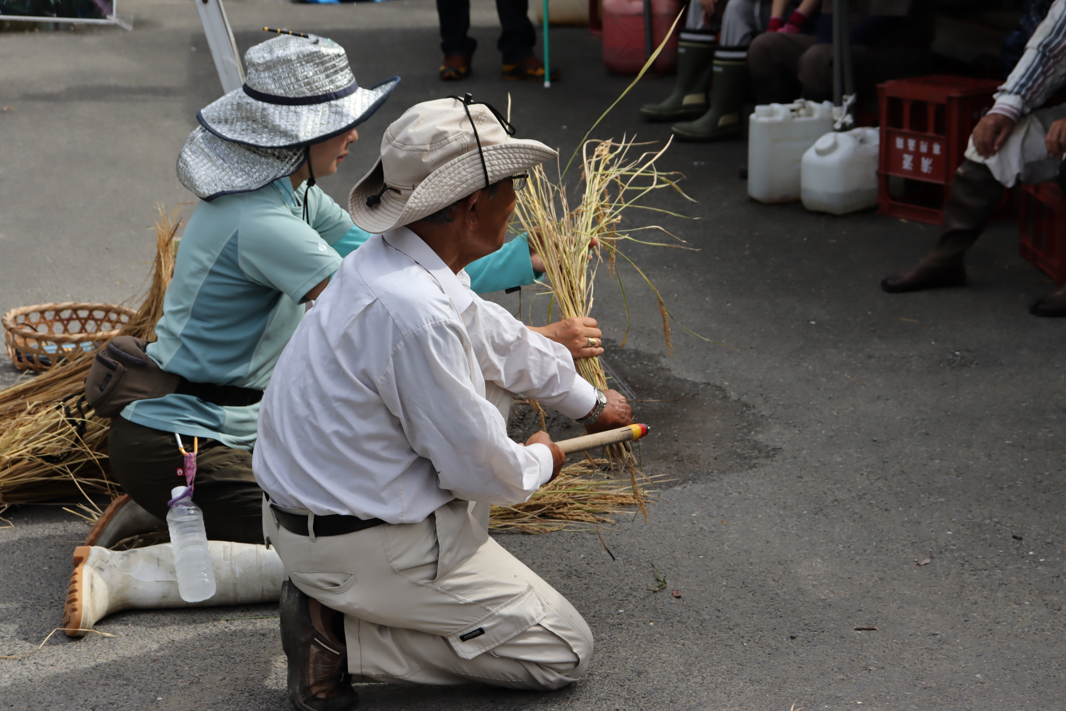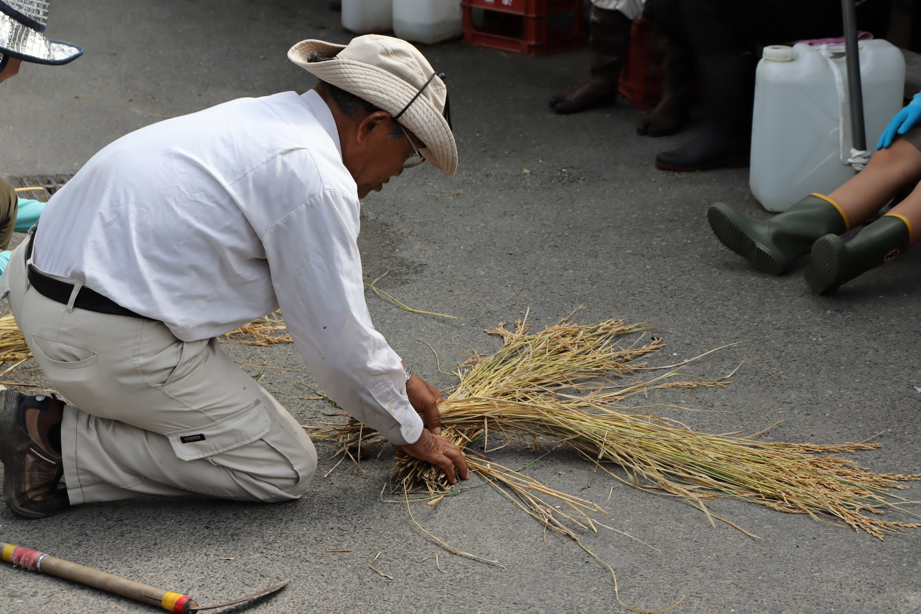 稲は親指を上にして、腰を落として鎌を入れて下さい!