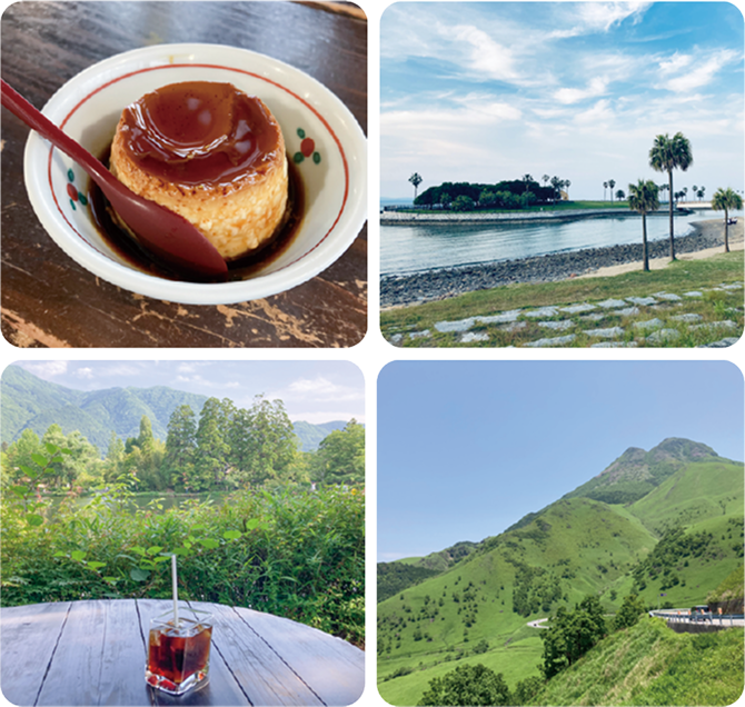 右上:別府湾に面した田ノ浦ビーチ。公園内には人口島が。左上:自然の噴気で蒸す「地獄蒸しプリン」。右下:約50㎞のドライブルート、やまなみハイウェイ。左下:湯布院・金鱗湖のほとりにある「CAFE LA RUCHE」。