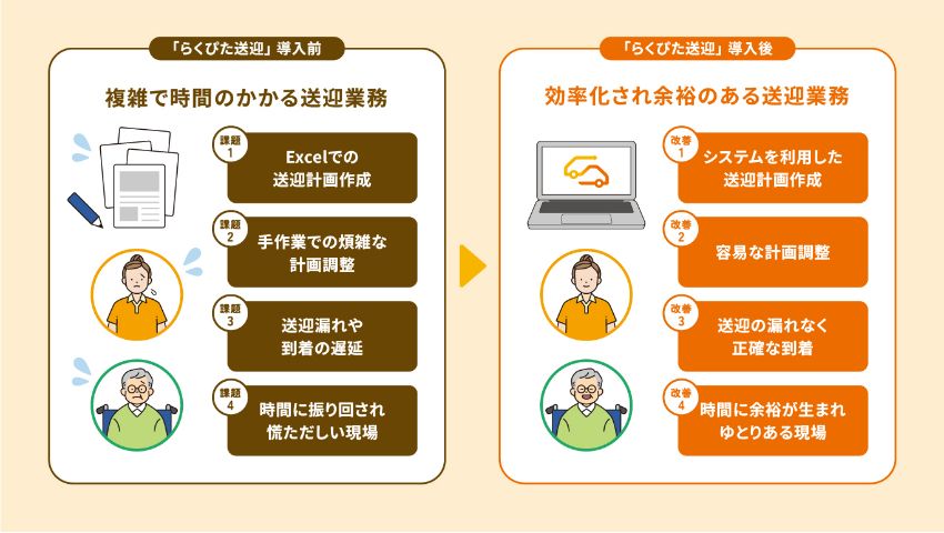 「らくぴた送迎」を導入してからは、日々生じる変更への対応が簡単になっただけでなく、送迎計画が効率化されたことで施設への到着時間も早くなったそうです。
